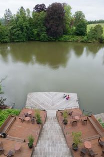 The spacious living-room has a stunning view of the private lake, the dining room has access to the terrace overlooking the valley of the Vachau. The beautiful terrace at the private lake is only accessible to our guests.